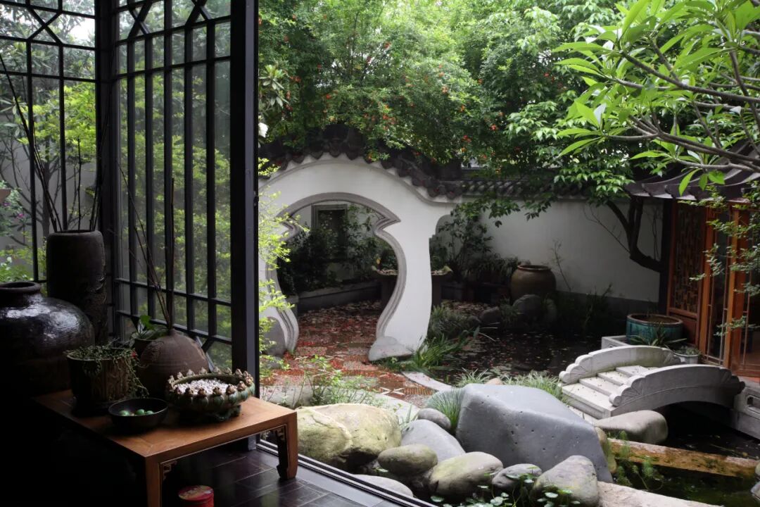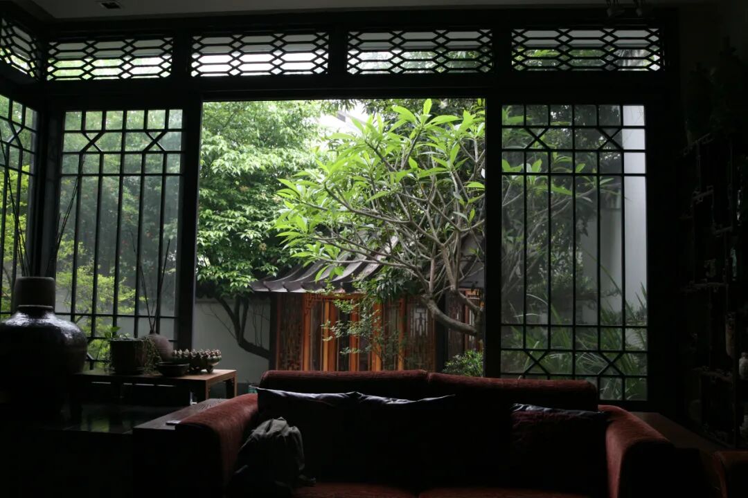 坐在屋内,透过大玻璃窗看着院内的水面小景,心境霎时宁静下来,