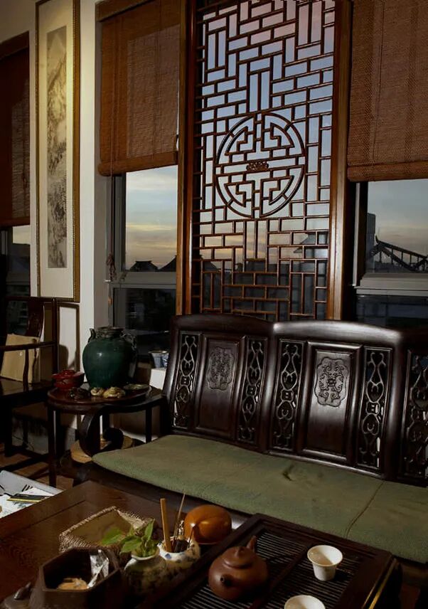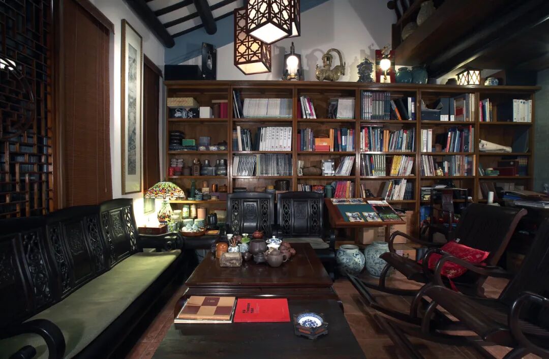三楼的书房更让人流连忘返,这里没有电视的喧嚣,只有主人的茶香在空间弥漫。仰看明式木雕横梁上瓷瓶陶罐叙古,