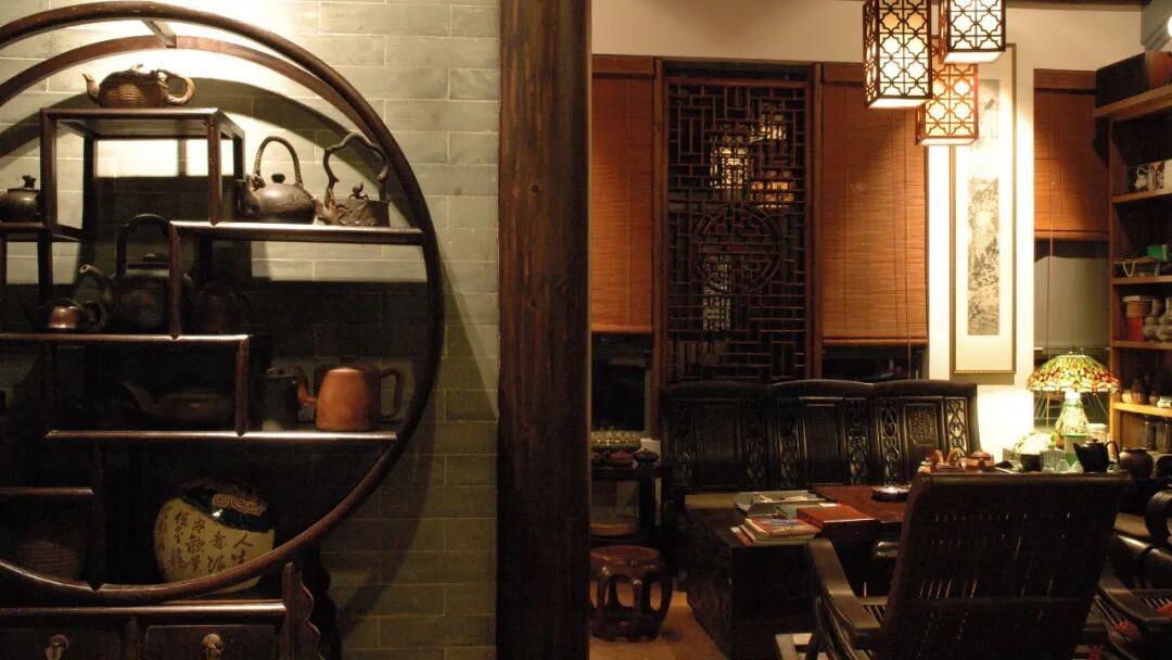 俯视酸枝木柜中紫砂公仔相伴。远望岭南木通花窗外树影婆娑,近观实木书柜中诸子百家争艳。