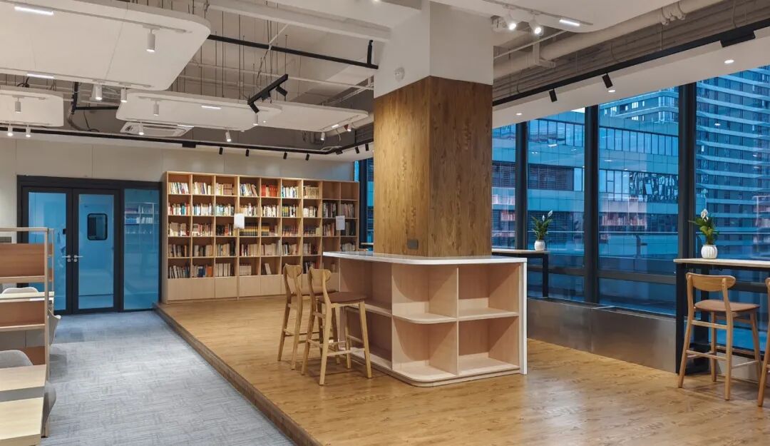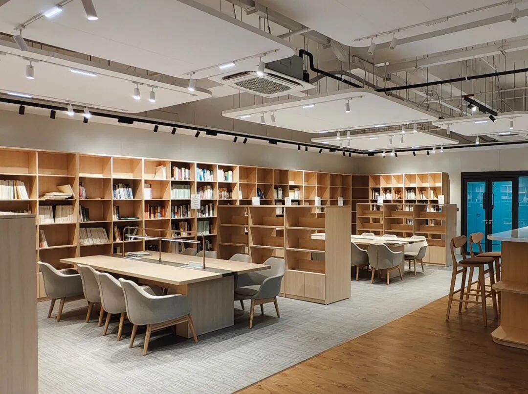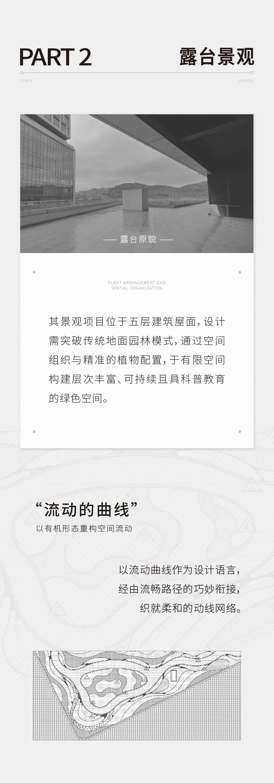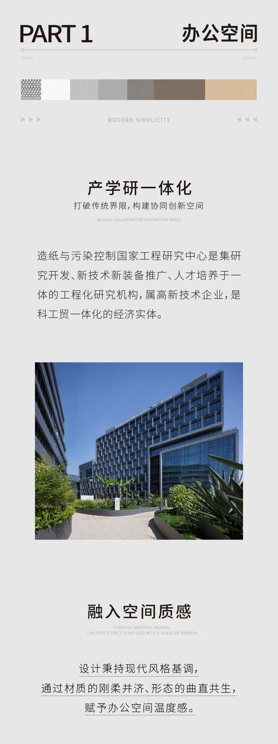 每间会议室都承载着不同的功能属性,线性光带依据空间特性进行差异化布局,光线成为了空间叙事的隐形语言,于不同场景中达成氛围平衡。既满足藏书与展示功能,又以规整的布局为五层阅览区注入了秩序感。十层阅览室中,高低有序的定制书柜与阅读台构成空间视觉焦点,工业风天花与落地窗平衡木色质感,巧妙融合阅读、休闲等多元功能场景。保罗·克利曾言,“绘画是用一根线条去散步”,而曲线是最富韵律的步伐,勾勒出灵动婉转的空间画面。以植物标识牌为纽带,串联起不同展示种植区域的空间序列,通过分类标识牌系统化造纸原料科普。