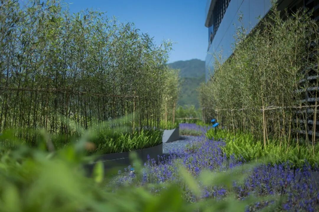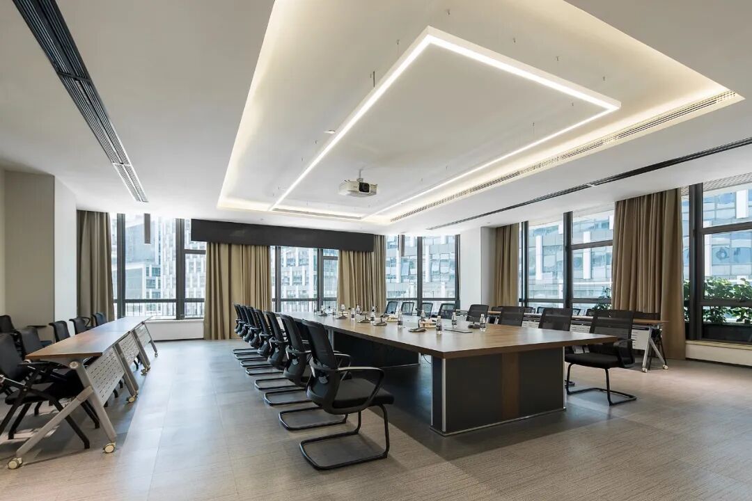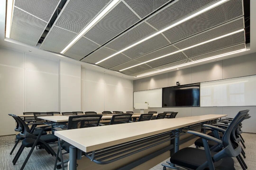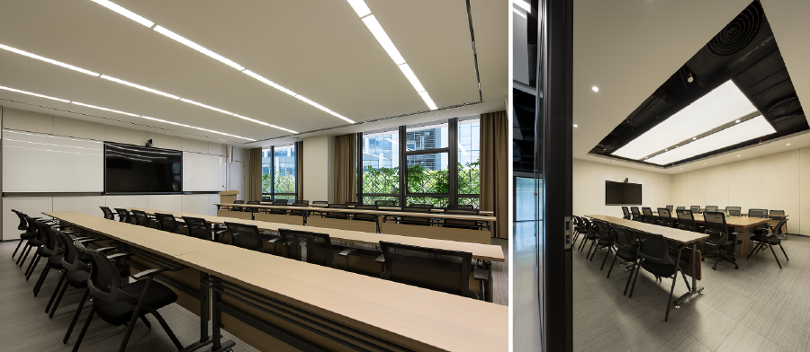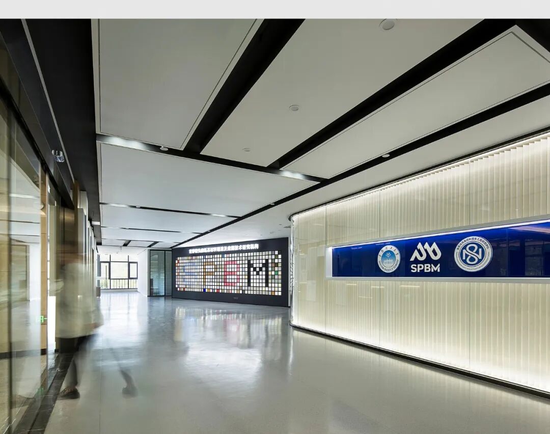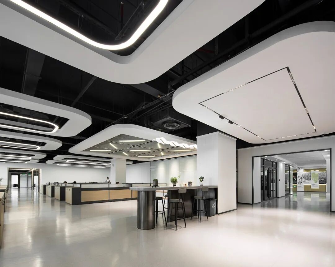 每间会议室都承载着不同的功能属性,线性光带依据空间特性进行差异化布局,光线成为了空间叙事的隐形语言,于不同场景中达成氛围平衡。既满足藏书与展示功能,又以规整的布局为五层阅览区注入了秩序感。十层阅览室中,高低有序的定制书柜与阅读台构成空间视觉焦点,工业风天花与落地窗平衡木色质感,巧妙融合阅读、休闲等多元功能场景。保罗·克利曾言,“绘画是用一根线条去散步”,而曲线是最富韵律的步伐,勾勒出灵动婉转的空间画面。以植物标识牌为纽带,串联起不同展示种植区域的空间序列,通过分类标识牌系统化造纸原料科普。