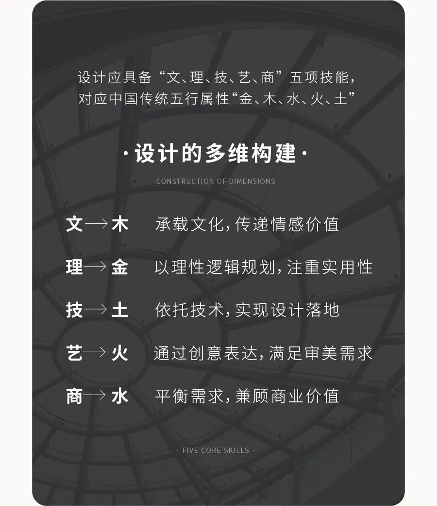 世间所有造物皆源于“金、木、水、火、土”,且设计活动的核心在于把握“文、理、技、艺、商”五个维度,从而实现自然属性与人文价值的统一: